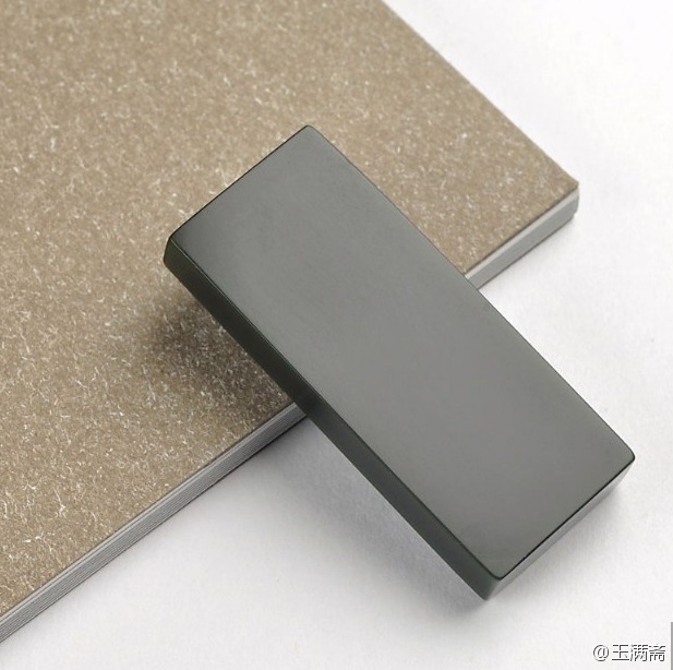 整器琢兽面衔环,状似古时富贵人家的大门铺首,下方饰以乳钉纹,倍显古色古香。兽面铺首是兽面纹中的一种,装饰门上,可驱妖避邪、避祸求福。此作品素面为底,玉质缜密油润,无瑕疵、绺裂。